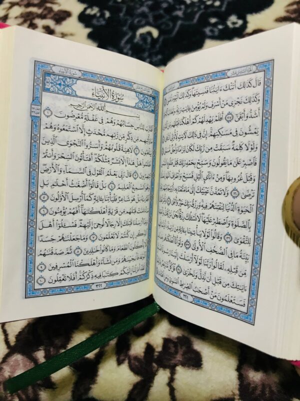 لون المصحف قد يختلف من نسخة لأخرى، لكن المقاس ثابت تمامًا في جميع النسخ.